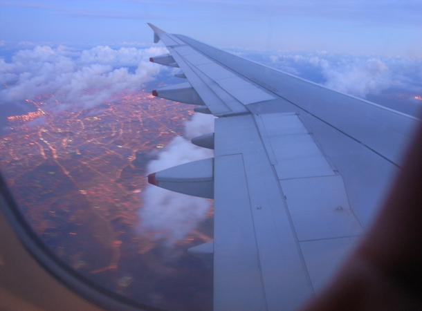 カサブランカ(Casablanca)上空からの風景。眼下に美しい街の夜景が広がりる。白熱電球(ナトリウム灯?)で統一されたかのような街の色。混み入った特徴的な街の姿を現している。