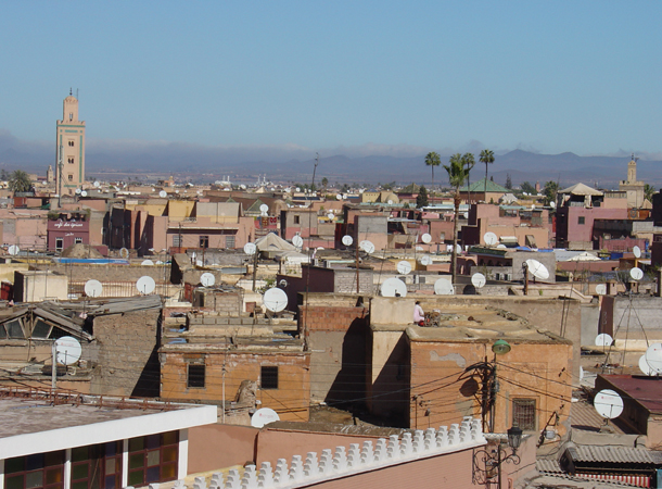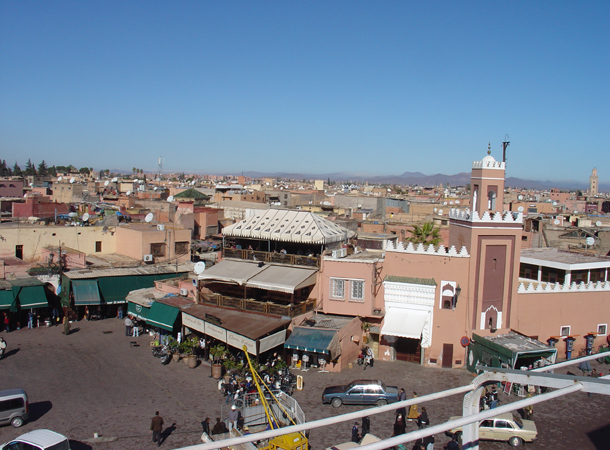 カフェの高さは確か4Fでマラケシュのメディナではそこそこ高いほう。町の建物はほとんどは二層以下で、建物が同じ高さで広がっている。それにしても大きな街。
