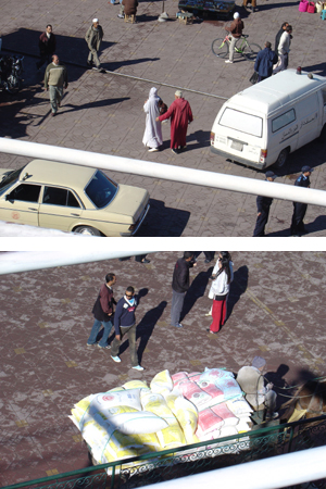 リャドから30分ほど歩いただけだが、モロッコの昼の喧騒にあてられ少々頭と体がくらくら。広場を見渡せそうなカフェに入って、一休み&作戦会議。