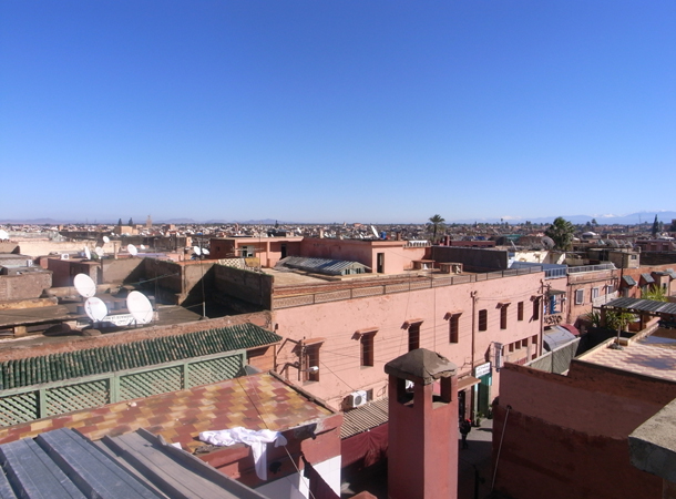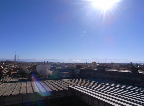 青い突き抜けるような空。遠くに雪をかぶったアトラス山脈が見える。この青い空は昨夕降った雨のおかげらしく、午後にもなるとだんだん街の生活から立ち上るホコリ・湯気でだんだんとスモッグがかってくる。