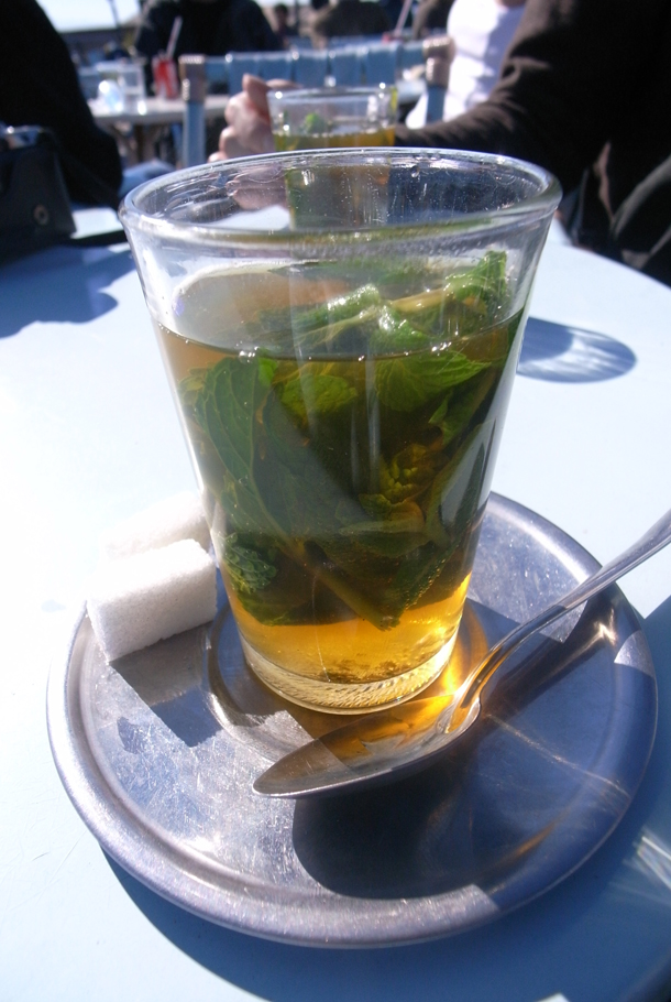 基本的にイスラム教で飲酒を禁止されているモロッコ人はこのミントティーを、お茶・お酒代わりに非常によく飲む。どこのカフェ・レストランに行っても必ずある。後に出会うベルベル人は「ベルベル・ウィスキー」と呼んでいた。乾燥した咽喉を潤し休ませるのに最適な飲み物。そういえば街中でミントの束があちらこちらに売られていた。