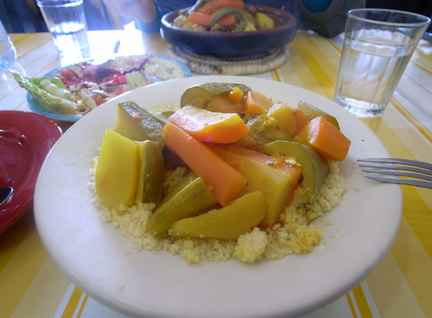 まずはモロッコ料理の定番をということで、クスクス・タジン・サラダを注文。サラダは生野菜に香辛料やオリーブ油をかけただけのシンプルなもの。新鮮な野菜が嬉しい。クスクスはベジタブルを注文。スムールと呼ばれる租粒状固めて蒸された小麦の上にやわらかく煮たニンジン、ジャガイモ、ズッキーニがのせられている。さらにその上からスープをかけて食べる。意外と薄味で飽きがこない。日本人好みかも。スムールはスープをすうためか、お腹の中でどんどん膨らんでいくイメージ。食べ過ぎると危険。タジンは土鍋の煮込み料理。土鍋は円錐の蓋が特徴的。このときはチキンを注文。これまたニンジン、ジャガイモのほか、カリフラワーやインゲン豆のようなもの、オリーブなどが一緒に煮られている。サフランやパプリカなどによる味付けが特徴的。おいしい。三品でも二人で充分な量。あからさまに外国人観光客向けではない点と何より味に満足。幸先いい。