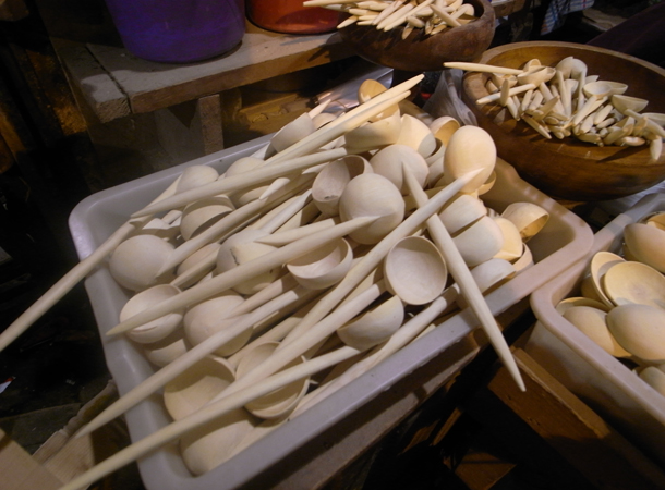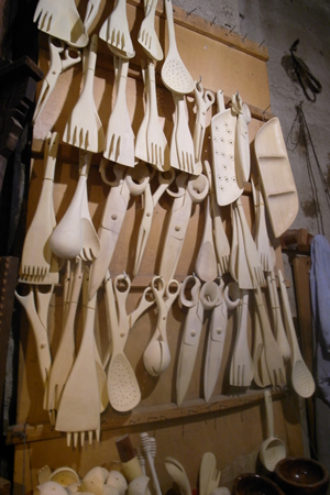 お店の様子は写真の通り、立ち止まらずにはいられない。できれば物をつくっているところをじっと見ていたいくらい。壁にかかっているのは料理道具。スプーンやフォーク、お皿やヘラなど。驚きなのは鋏。試してくれたが紙なら切ることもできる。ものすごい精度。どれも同じ白木でつくられているが匂いを嗅ぐとかすかにレモンの香りがする。レモンの木?