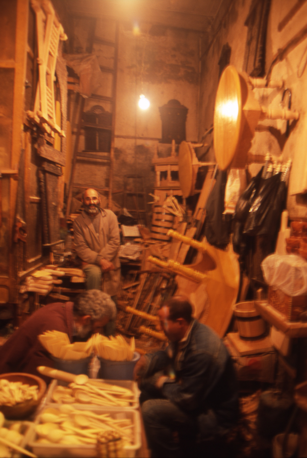 間口2.5mくらいの小さな木工品のお店。奥ではお爺さんがまさに商品をつくっている。とても誠実そうな人。入口付近でしゃがんでチェスをしているおじさんたちは近所の人らしい。