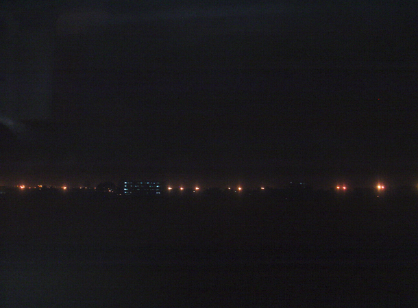 しばし待つとようやく電車がきて乗り込む。荷物があったので1等のコンパートメントに。といっても安い。こちらは乗客も少なく妻と独占。でも空調が壊れているのか寒い。写真はカサブランカの窓からの風景。都市部でも夜は暗い。ということで、車窓はほとんど楽しめず。
