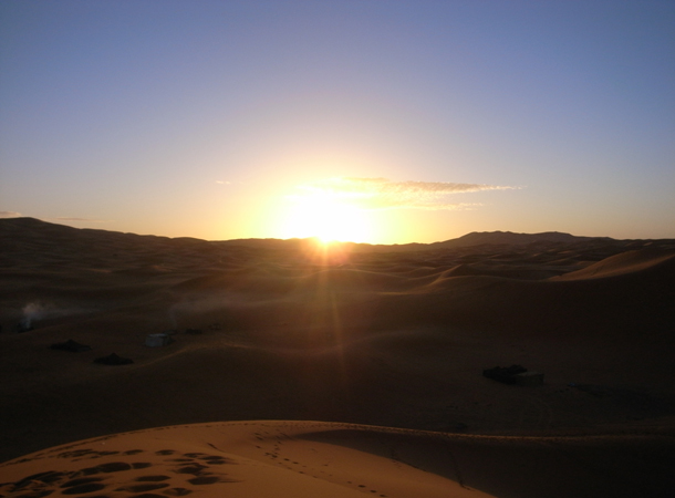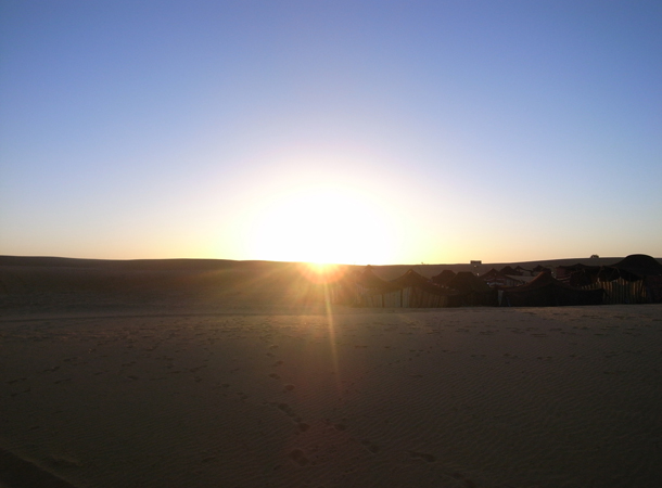 10分ほど進むと日の入りの風景に。手前に見えるのはラクダ用か観光客用のベルベル式のテント。
