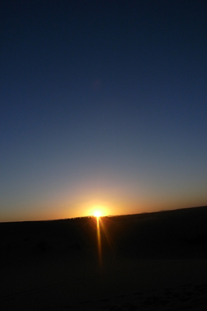 地平線から上がる太陽。ゆっくりと砂丘を上から照らしていく。砂丘群は波のよう。