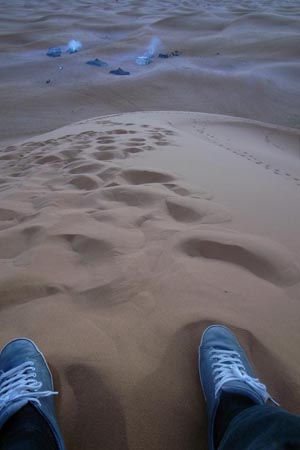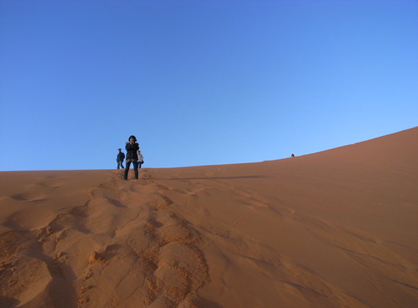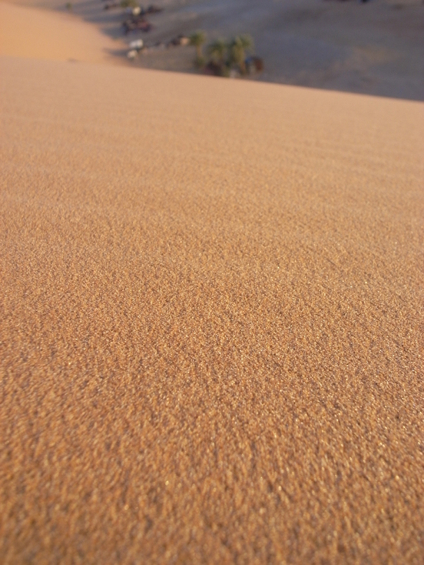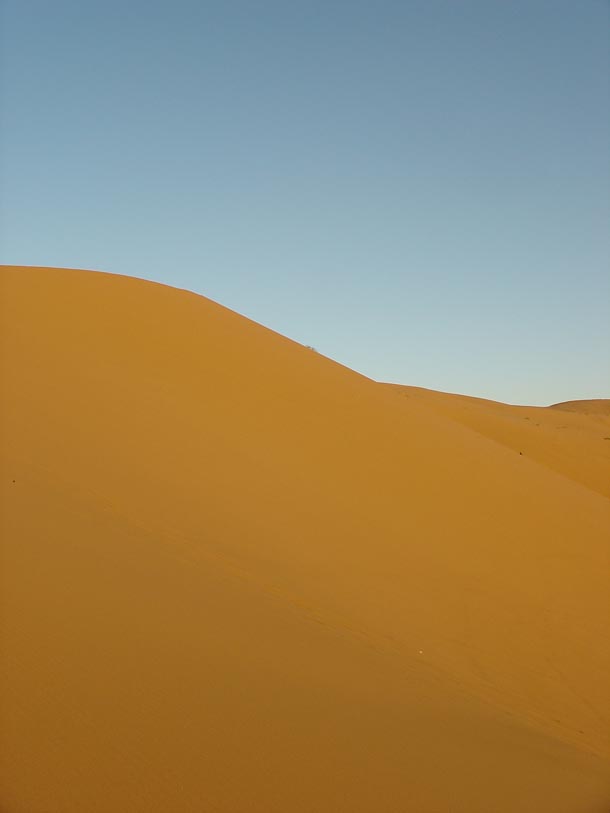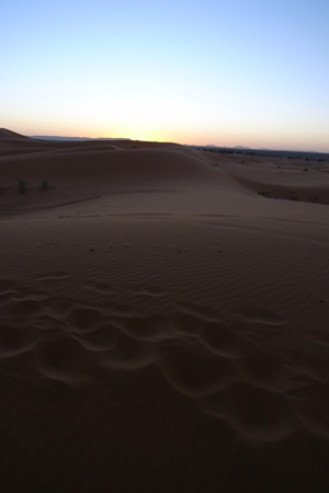 砂丘は巨大で意外と急。日の出前の陰影の少ない砂の固まりは距離感を掴むのに苦労する。