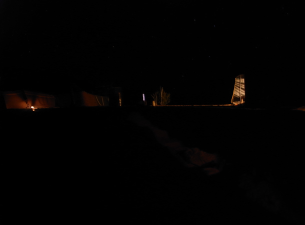 最後に驚かされたのは、少し荒いラクダの毛のテント生地を通して外の空の星が見えること。少し顔を動かすと星が瞬いて見える。