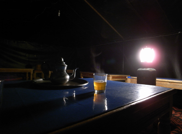 オイルランプの光の中、まずはモロッコ式ミントティーで一服。思えば遠く辺境まで来たものだ。