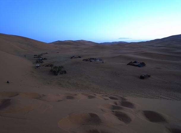さらに進むとひときわ大きな砂丘の山の麓にテント群がうっすらと見えてくる。どうやらそこが今晩泊まる場所のようだ。