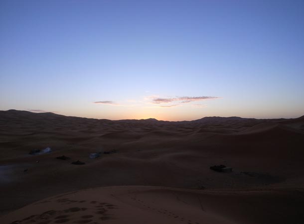 背後の大きな砂丘をみると、すでに何人かが登っている。どうやら高い位置で日の出をみるらしい。我々も少し急ぎ気味に移動を開始する。