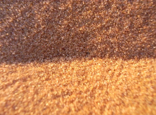 砂を接写。砂は単一の粒子ではなく、赤い粒子、黄色い粒子、少し透けた白い粒子など、無数の粒子から成り立っている。