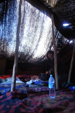 さすがに冷えたのでテントにもどり、ダウンを着たまま毛布にくるまる。地面には絨毯が何重かにわたって敷かれるが砂の感触が体に伝わる。
