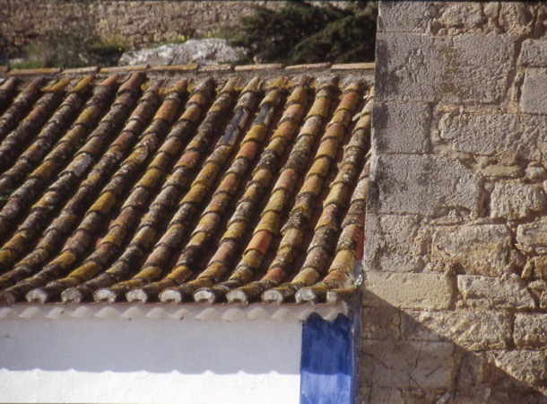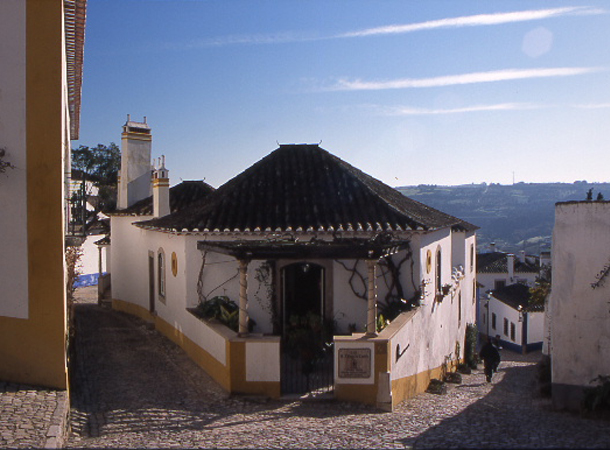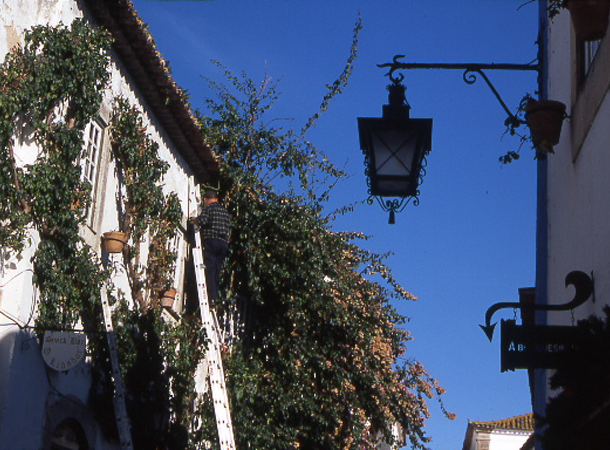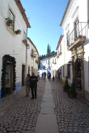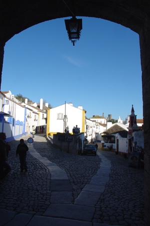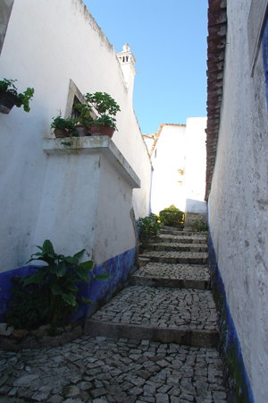 オビドスのメインストリート。石畳の両側には、ほとんど二層以下の建物。漆喰の白い壁の足元や外壁端部には黄色や青で着色がなされているが、これはオビドスの旗の色からきているとか。道のあちらこちらにある花壇や壁、窓際に掛かっている植木鉢の緑が、街の雰囲気を明るくしている。緑はよく手入れをされているようだが、いかんせん冬だったので花はほとんどなかった。季節のよい時期はもっと鮮やかなはず。