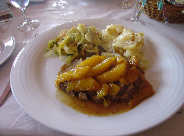 アヒルの胸肉のロースト。ほとんど臭みのない柔らかくほのかに甘いローストに、少しすっぱいオレンジソースがかかっている。素材の味が素直にでているのだが、経験にない組み合わせ。