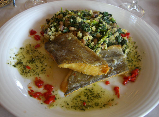妻のメインディッシュ。バカリャウの揚げに野菜。リスボンよりもはるかに繊細な味付け。これまた旨し。