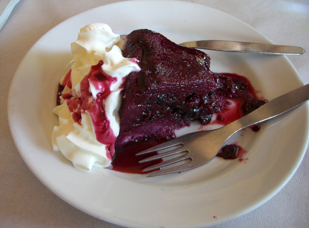 ラズベリー(クランベリー?)とほとんど一体になったプディングに生クリームがついている。かなり濃厚そうに見えるが、食べてみるとほどよい酸味と甘み。これまた・・。
