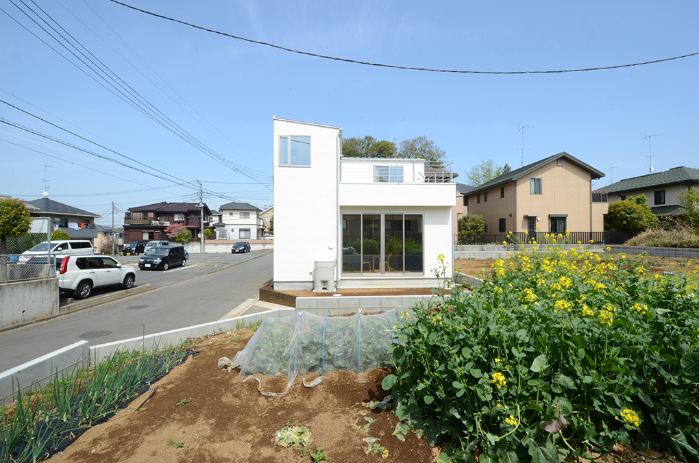敷地周辺は住宅と畑が混在する環境の中、敷地内でも植物や野菜を育てるため、家の周囲の空地だけでなく大きなルーフバルコニーを計画。
