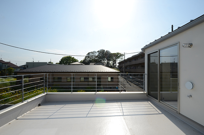 周りに建物が増えることを想定した将来もルーフバルコニーに日の光があたりつづけるように、ルーフバルコニーの床面を一段高い位置に配置し、