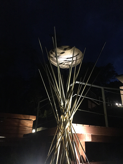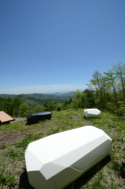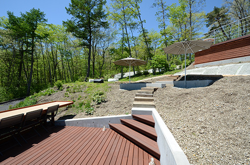 少し複雑な勾配の斜面に、木デッキやコンクリートのベンチ、家具などを散りばめ、