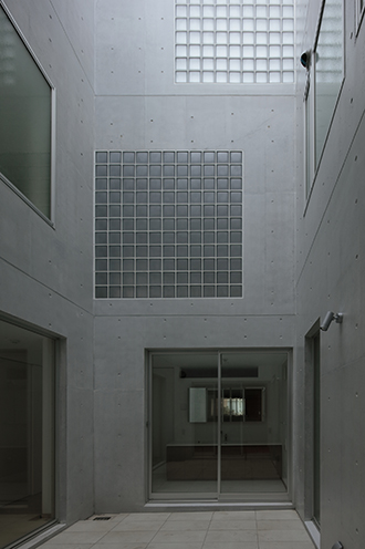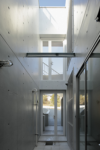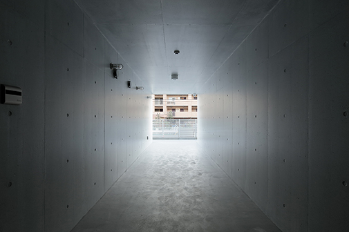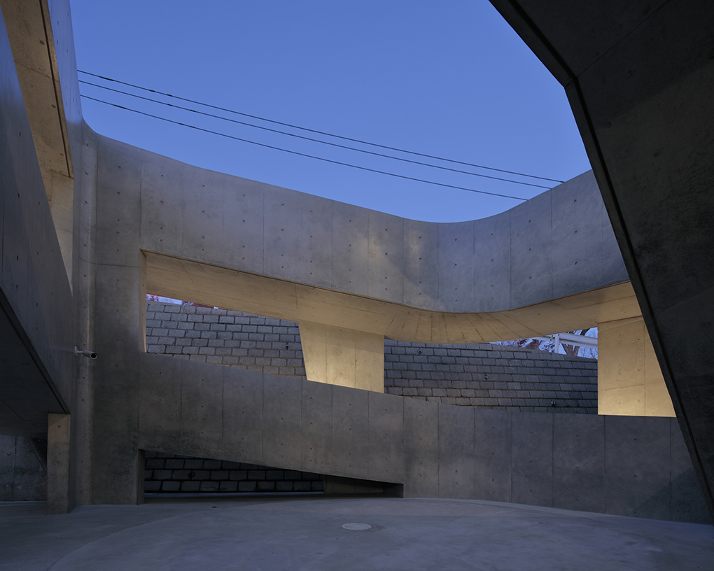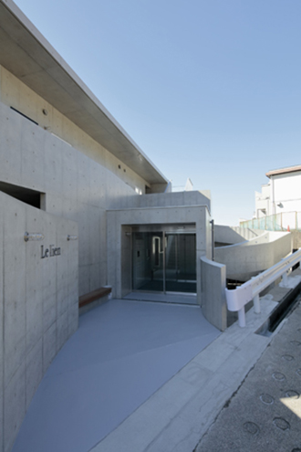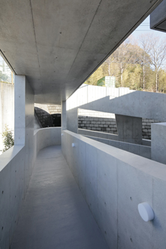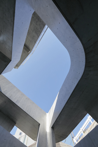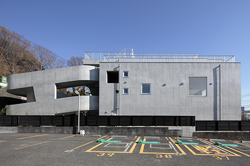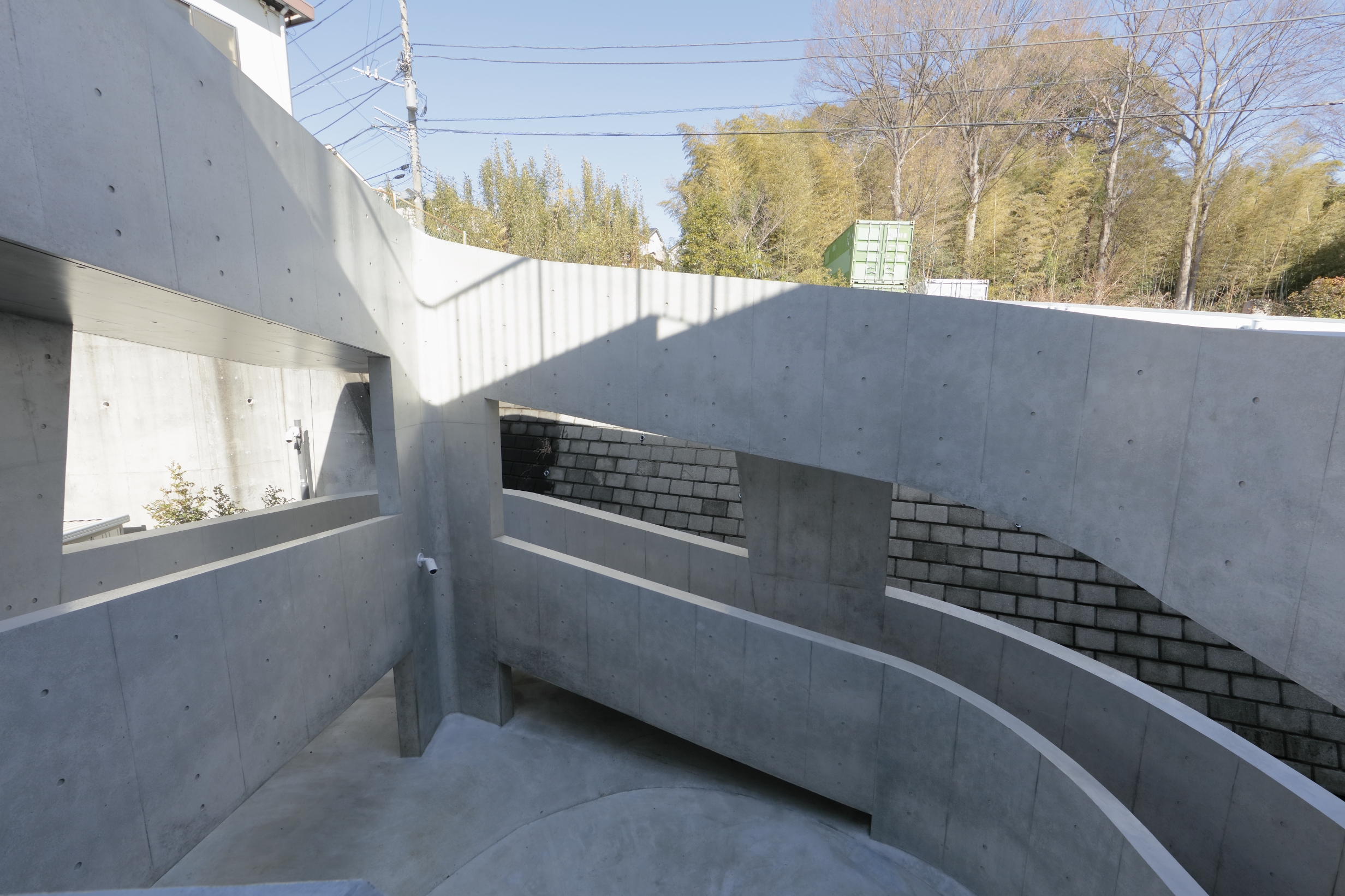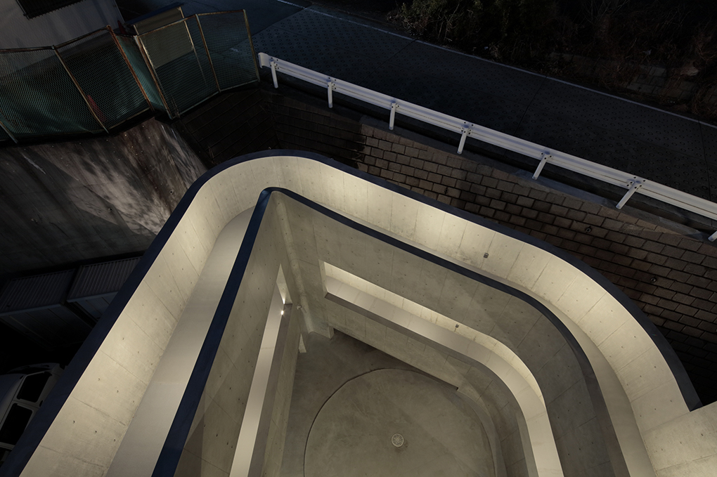 2階レベルの道路に接する北側背面には、メインエントランスと各階をつなぐ螺旋状のスロープをつくり、