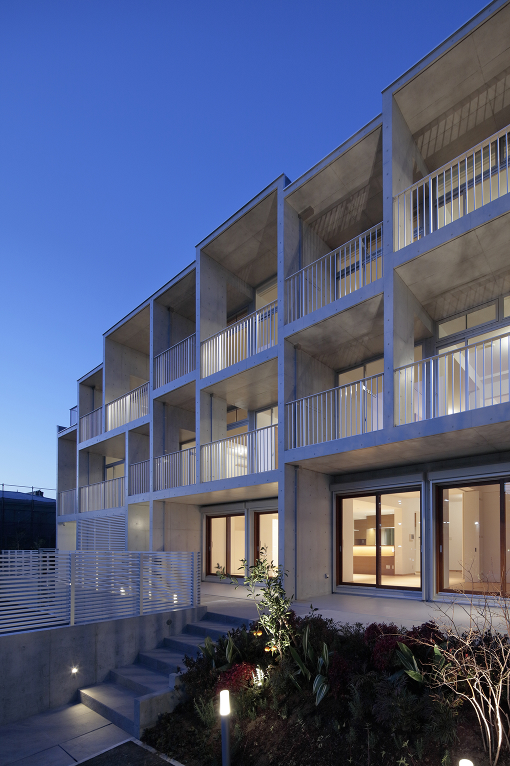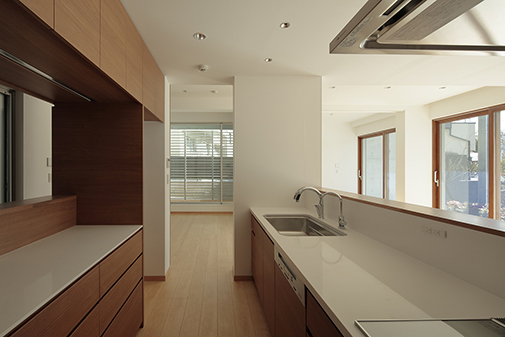 幹線道路沿いの大きなボリュームの共同住宅や店舗と、その背後の戸建て住居の多い住宅地との境界線上に建つことから、