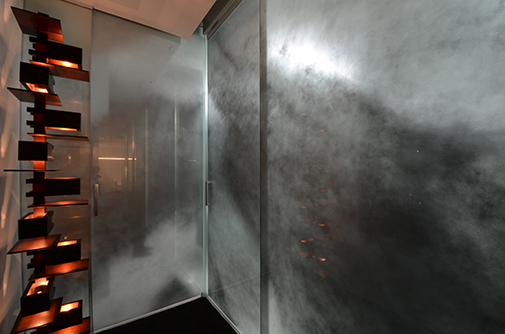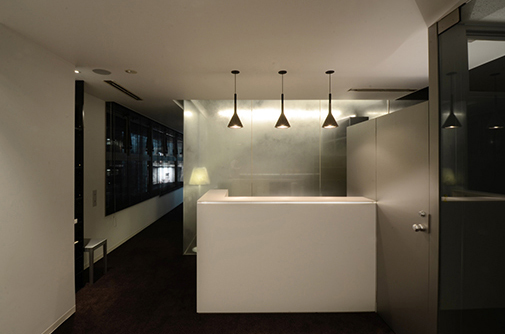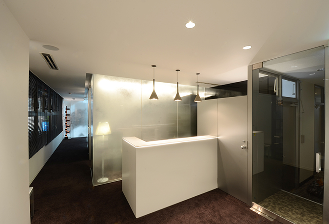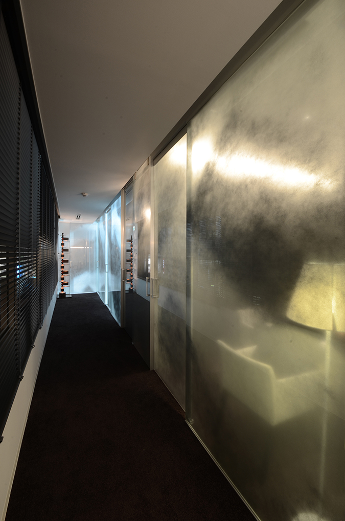 廊下と各室とのガラスで区切り、そのガラス面に金属の粉末が含まれた塗料を不均一に吹付け、透明性と非透明性の両方を持ち合わす境界を創り出すこととした。