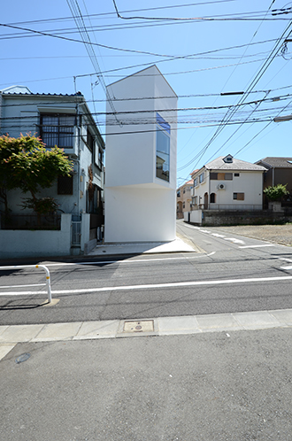 切り込み折りたたまれた形状の外壁は、外観の面的なボリュームのもたらす圧迫感を和らげている。