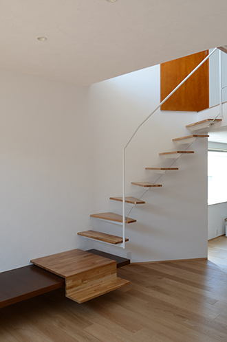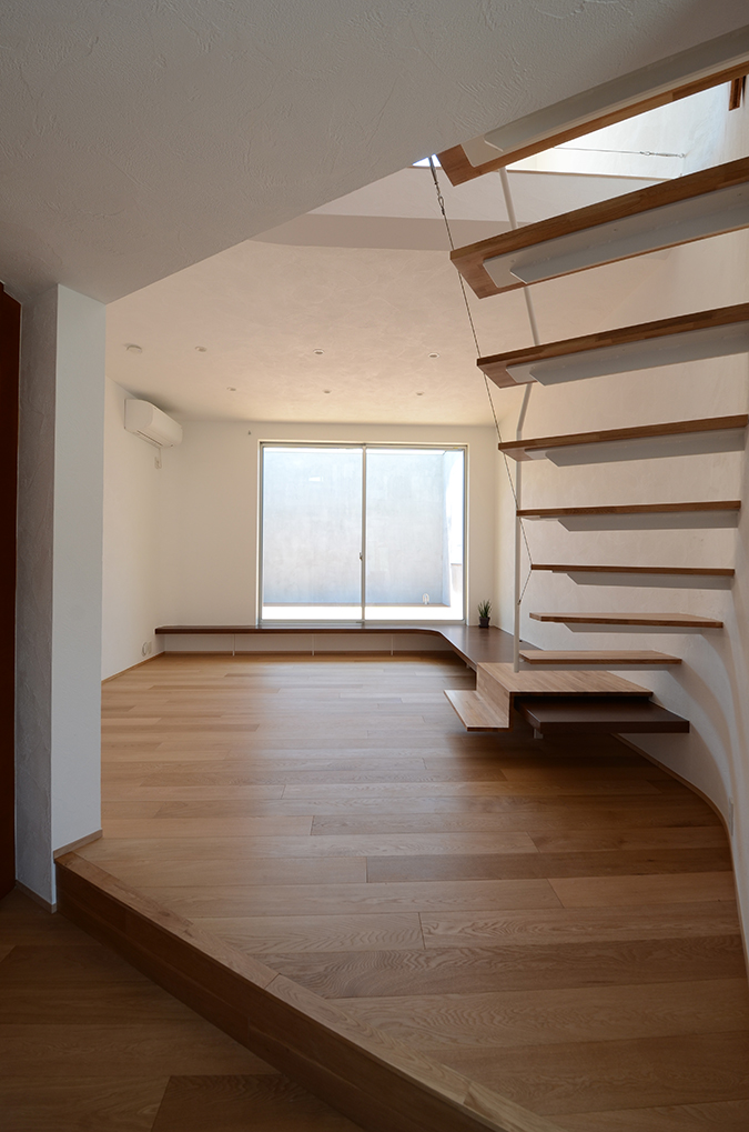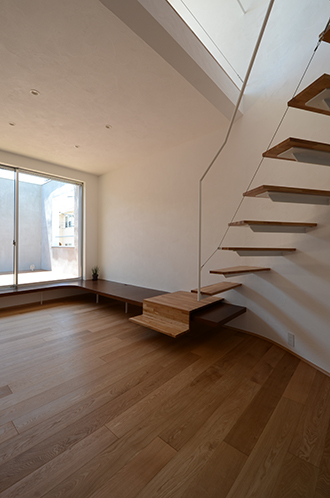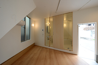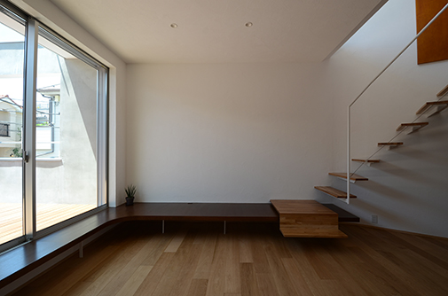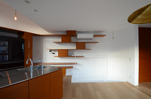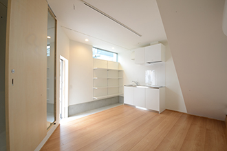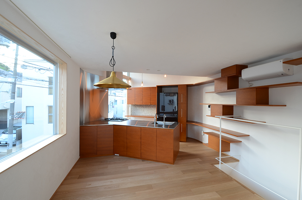 ここには開放的なキッチンが配され、クライアントが将来予定している料理教室・キッチンスタジオのためのスペースとなっている。