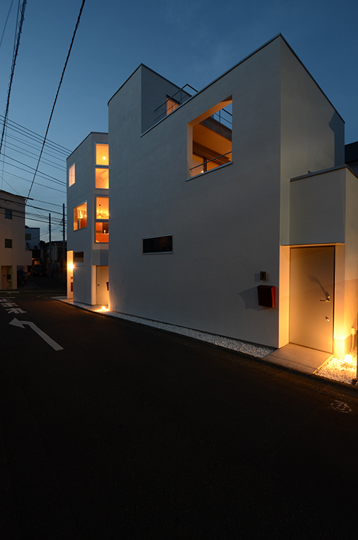 2,3階をクライアントの住戸。1階を2戸の賃貸住戸を含んだ長屋として計画している。