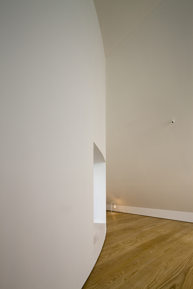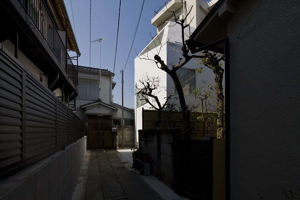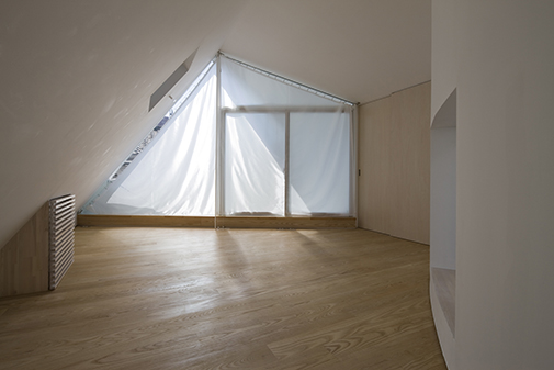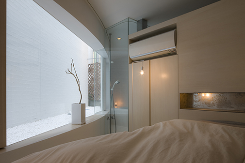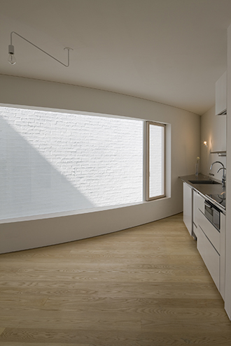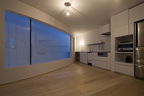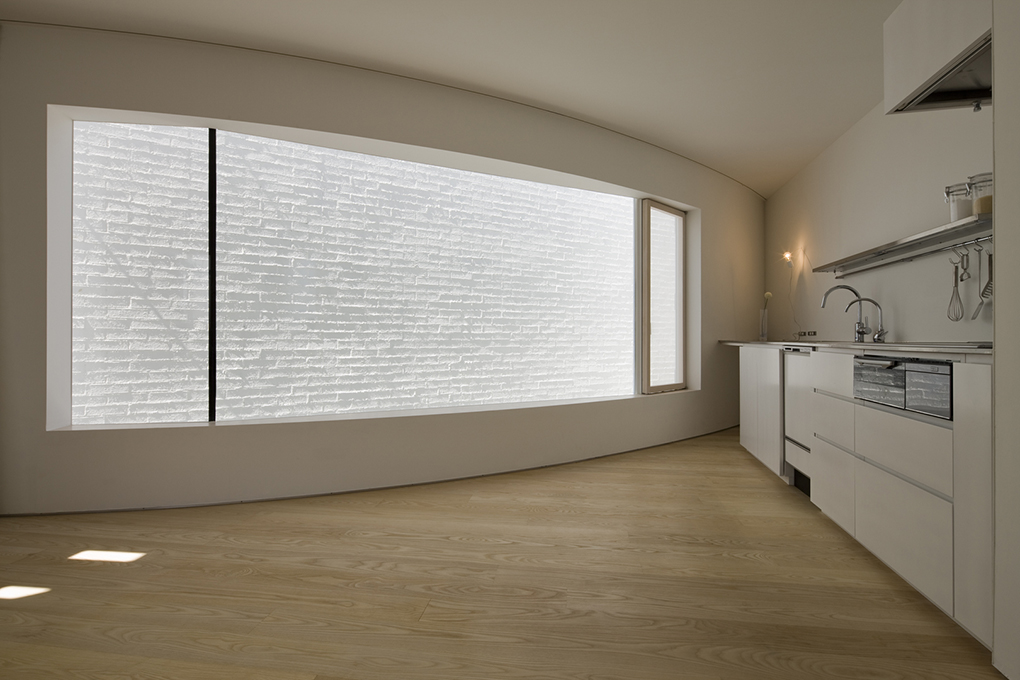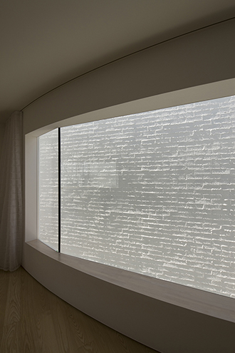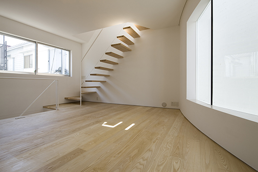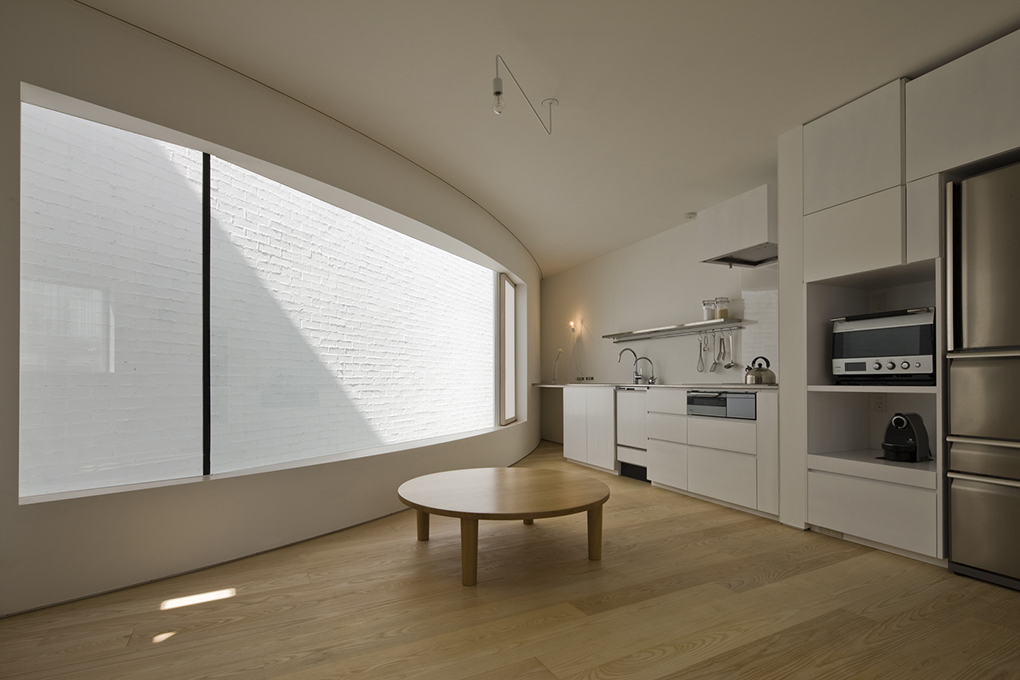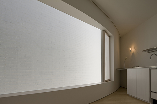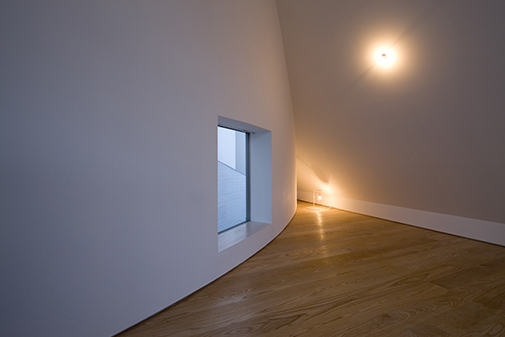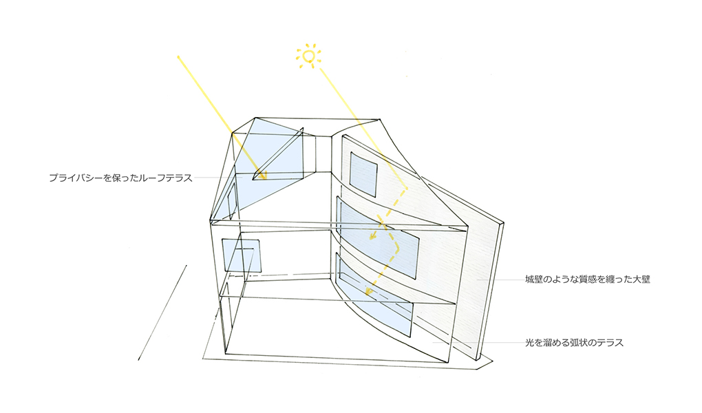 建物本体の外壁を弓状に変形させていくことで空隙はより長い時間、光溜りとなるようにしている。