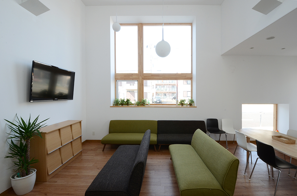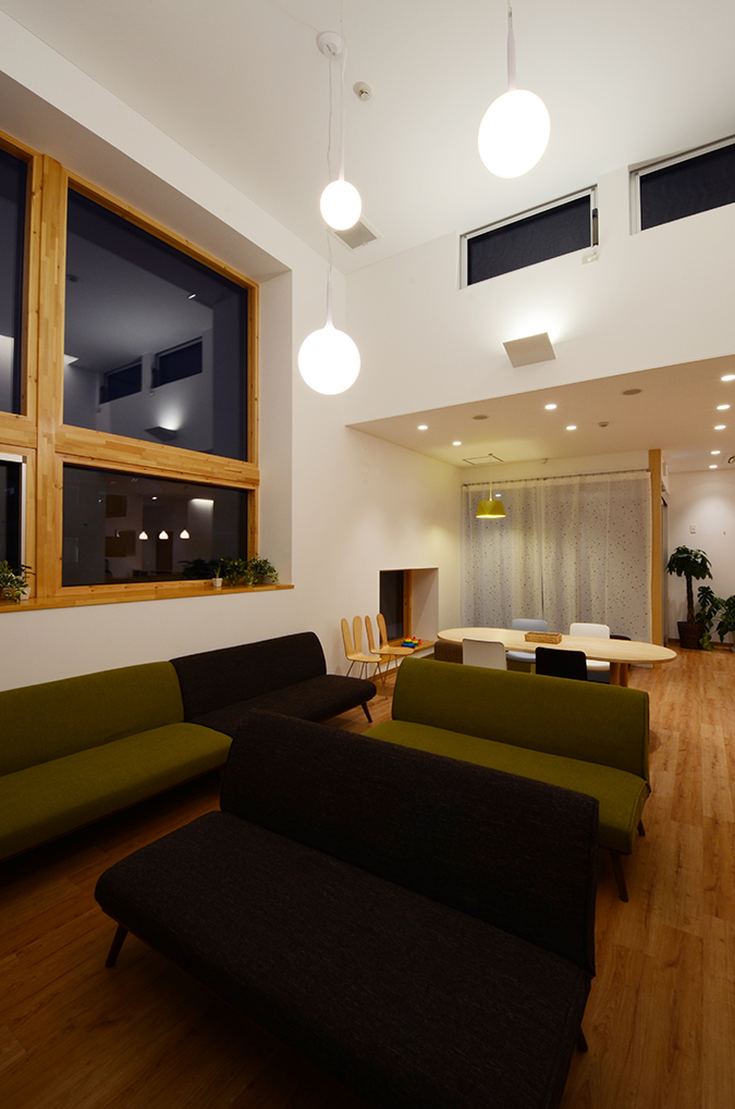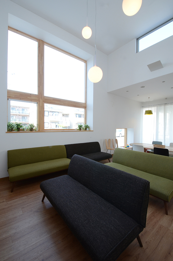 メインの待合スペースは天井高4.5mのダイナミックな空間となっており、大きな出窓から臨む空とトップライトから差し込む柔らかい光が開放感を生み出している。