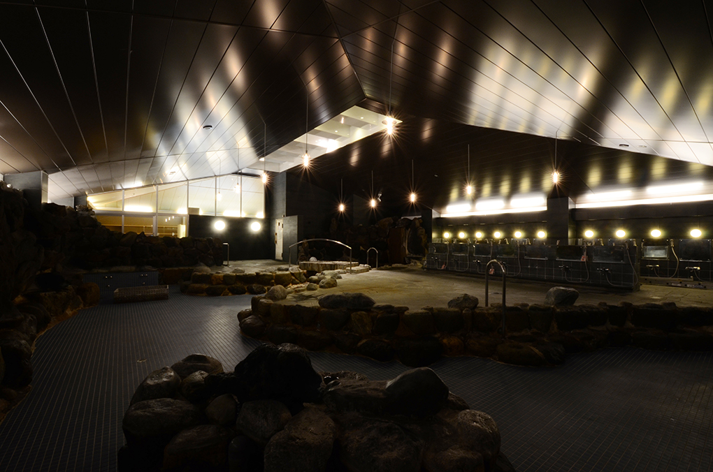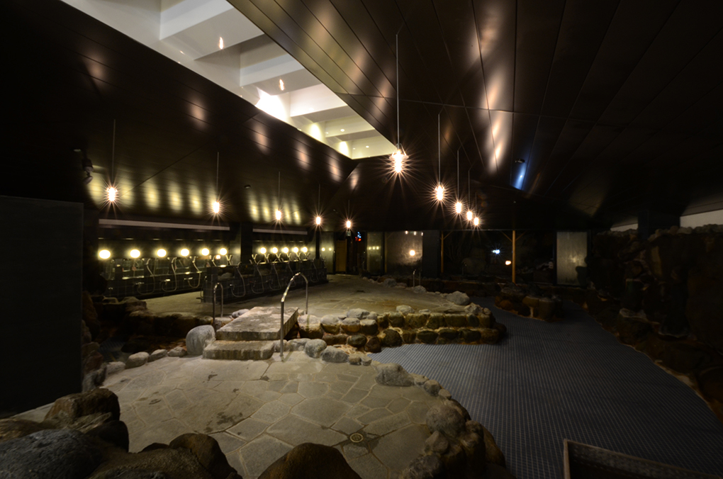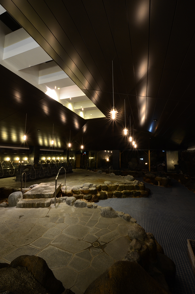 照明は点光源の器具を増やすことで、特に夜は湯気の中に光が揺らめく幻想的な風景をつくりだしている。