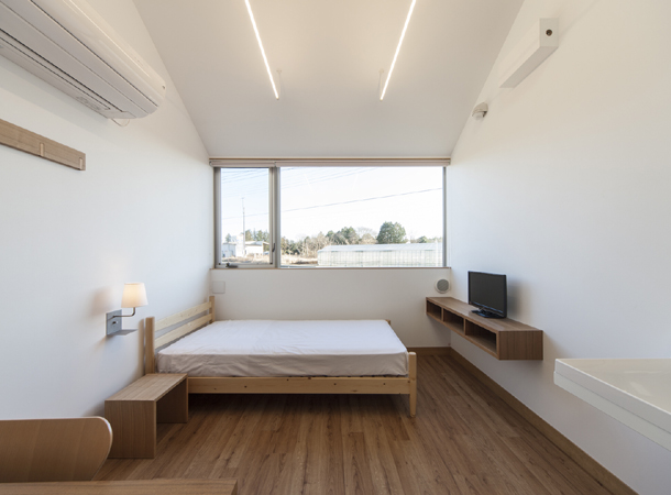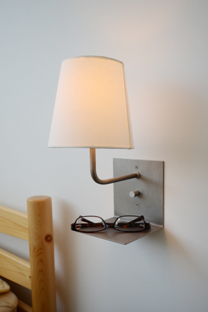 『あだち内科クリニック』の宿泊診察室のために制作した、ベッドサイド用照明。L次状のベースにメガネなどちょっとしたものを置けるデザインとなっている。手元のつまみで調光も可能。