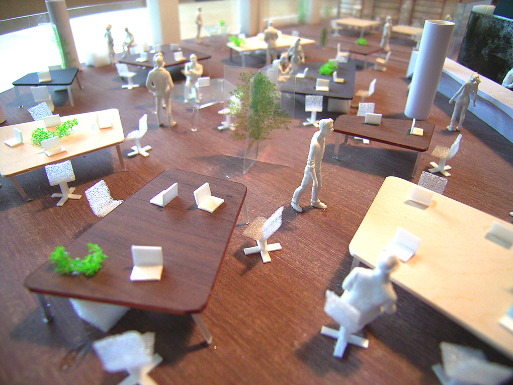単にいろいろなワークスペースをつくりだし、自由度を生んだようするのではなく、執務机自体もフリーアドレスにすることを提案。