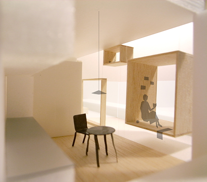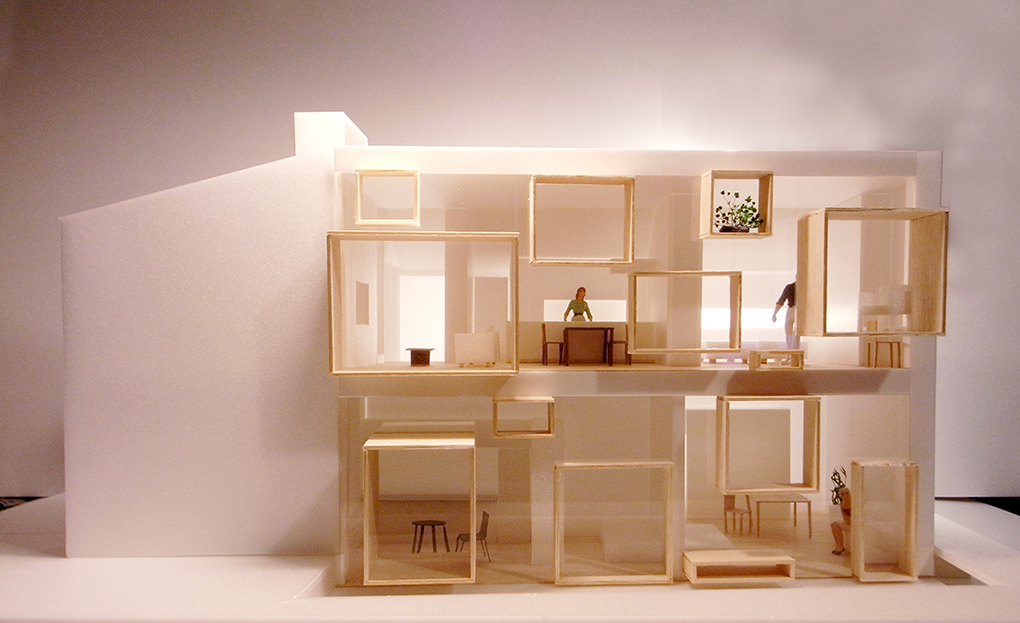 建物の配置上自然と発生する南側の空隙に対して大きなガラス開口を設けるとともに、半ばランダムに大小様々なBOX上の空間を窓面から飛び出し浮遊するように配置させた。