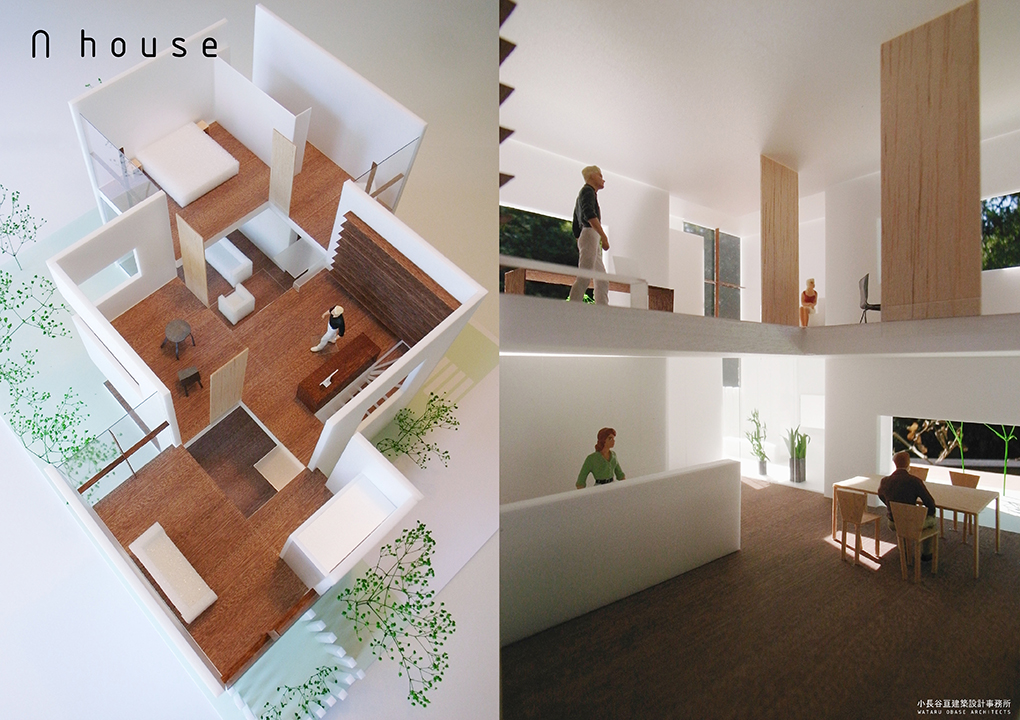 家の周囲に様々なサイズの庭をつくりつつ、外形のくびれにより内部はワンルームでありながら?え隠れするさまざま居場所を生んでいる。