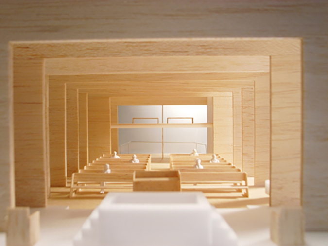 幾重にも重なる壁が外光を反射させることで、礼拝堂の中を光で満たすような空間を計画。