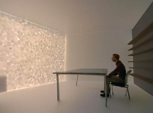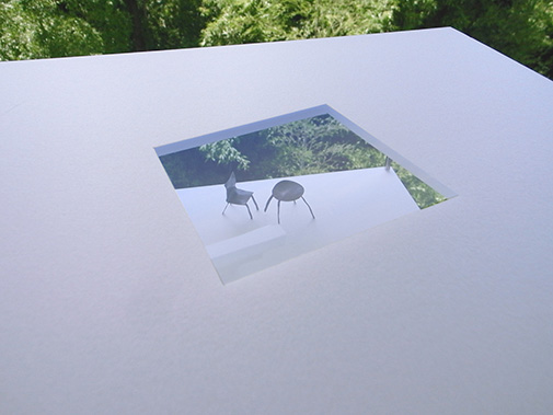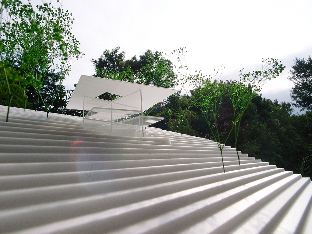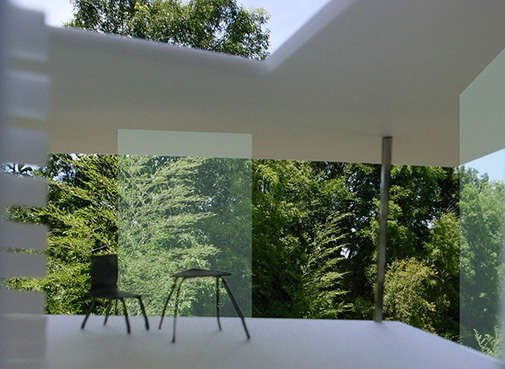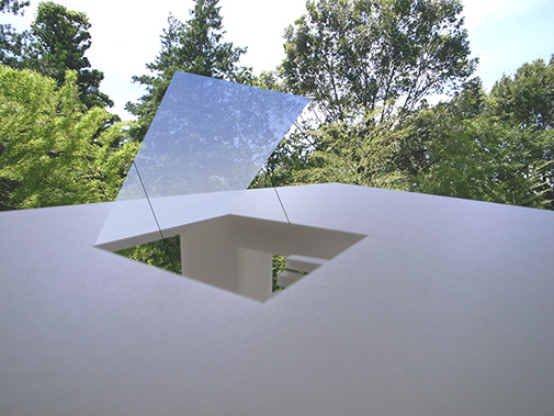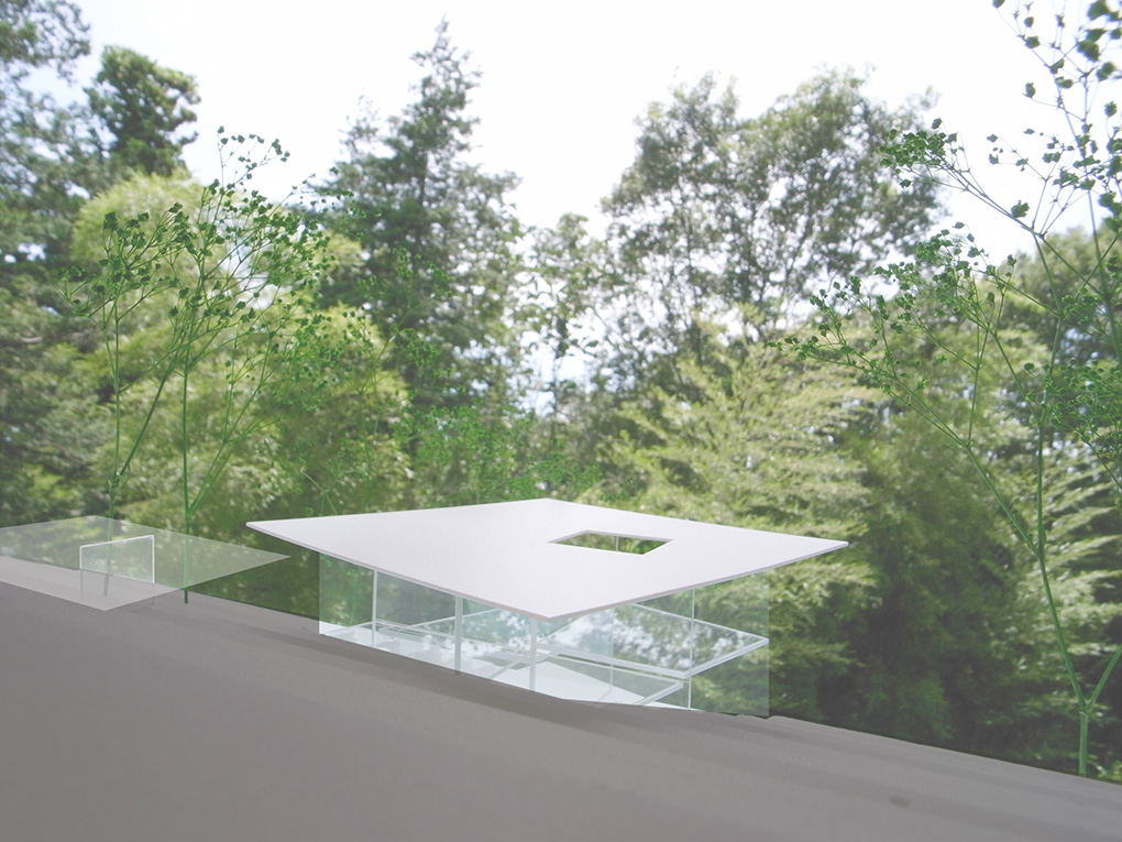 敷地は道路から下っていく斜面。 森の中に浮くように置かれた平らな屋根面から、建物の中に入っていく。