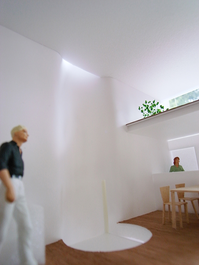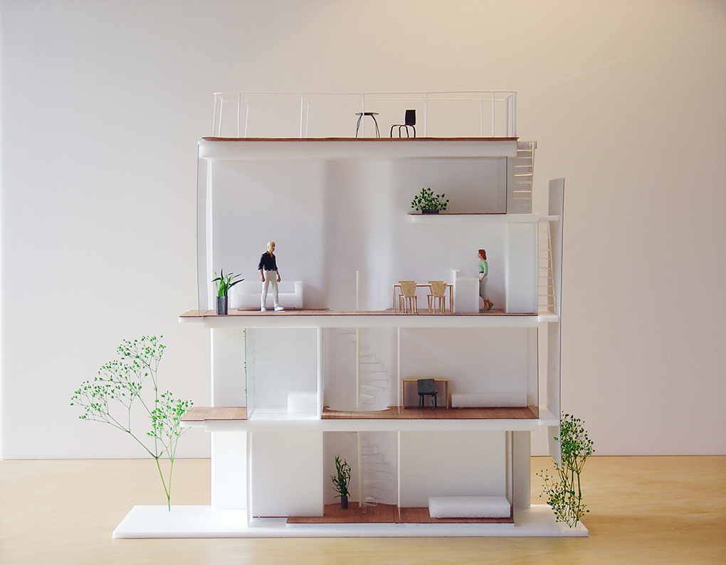 細長い建物の中央の階段を偏心させ外壁にめり込ませることで階段によって内部が分割される印象を消し去るとともに、凹んだ壁が建物の表情に彩りを与える。
