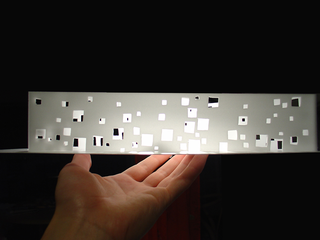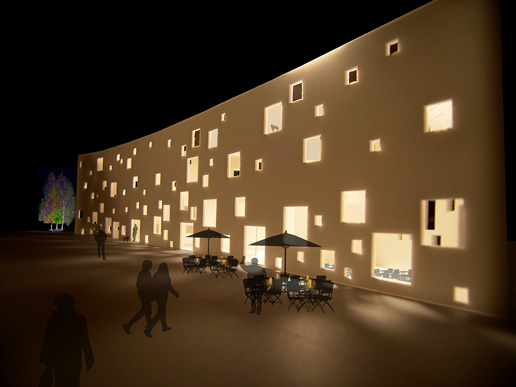 大きさの異なる正方形の窓をランダムに並べて少し不思議な駅前風景をつくりだそうとした。