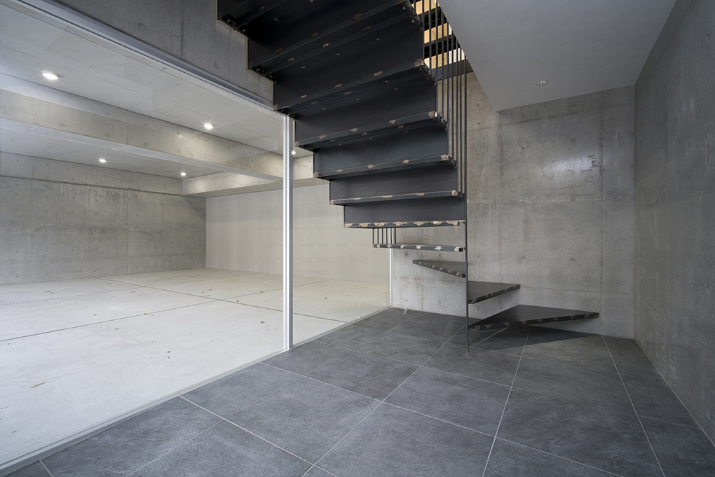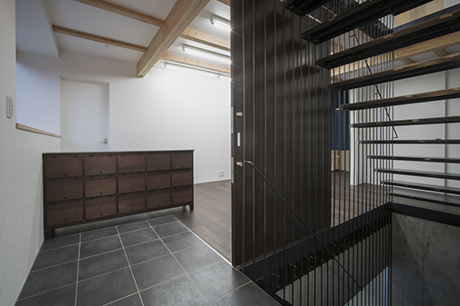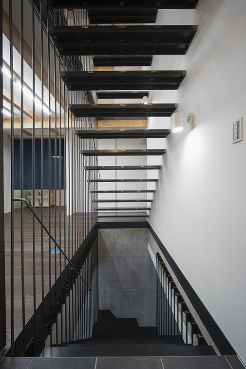 建物の中央を繊細な造りの階段が貫く。